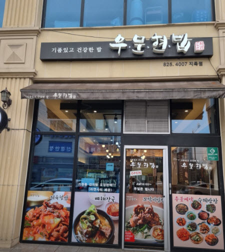 우문현밥은 이름부터 철학이 느껴지는 식당형 반찬가게입니다. 반찬 판매보다는 식사 제공에 중심을 두고 있지만, 메뉴 대부분이 집에서 먹는 반찬 스타일이라 포장과 테이크아웃도 활발합니다. 특히 올갱이국과 평양냉면 등 타 반찬가게에서 보기 힘든 식단이 매력입니다.